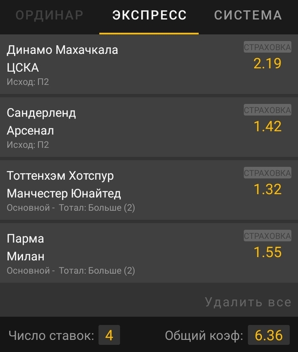 Таким образом, мы получаем экспресс из 3-х событий, с общим коэффициентом 4,85 Спасибо и удачи!