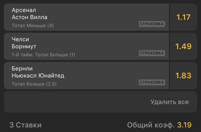 Ну и третий матч я взял Манчестер гол в 1 тайме, ну тут огромная разница в классе, у вторых просо нет шансов не пропустить) Итоговый 3.62