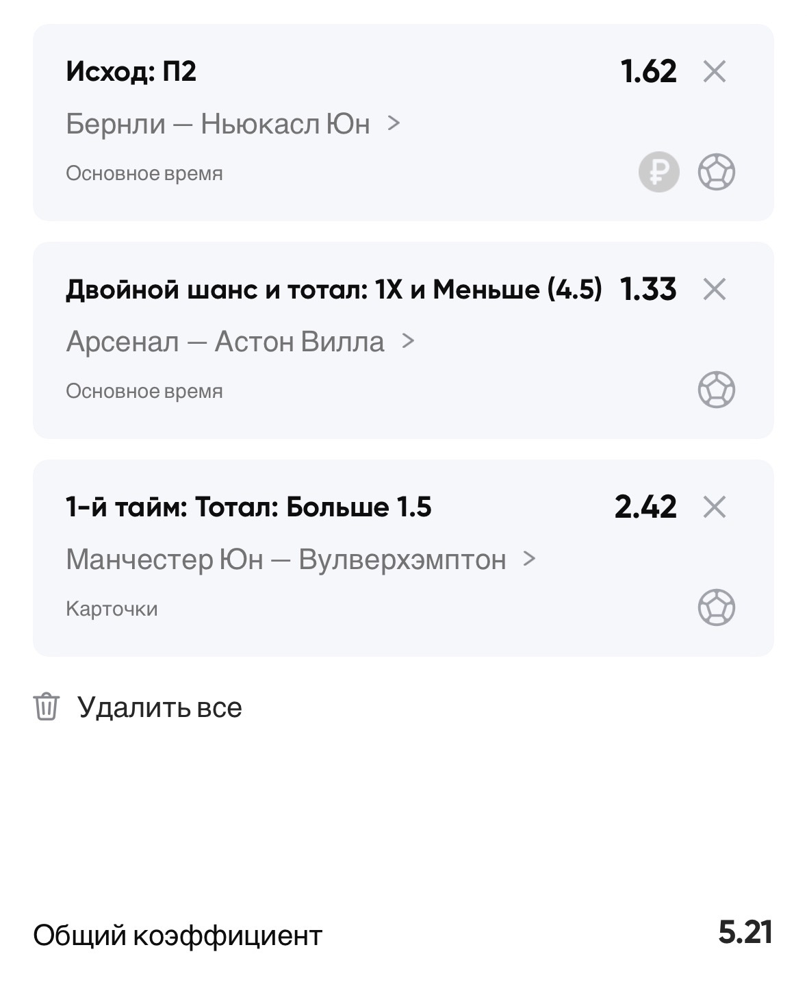 3) Арсенал - Астон ВиллаАстон Вилла подходит к очной битве с серьезными потерями. Из-за дисквалификации игру пропустят Мэтти Кэш и Бубакар Камара. Именно поляк забил один из голов в ворота канониров в первом круге. Вероятно, поэтому букмекеры выставляют хозяев столь явными фаворитами. Думаю Когда-то волшебство Эмери закончится, но в то же время не уверен что пушкари смогут легко одолеть виллу.Ставка: 1х и тм3,5 кф 1.55Общий кф 5.2161Пусть победит сильнейший!