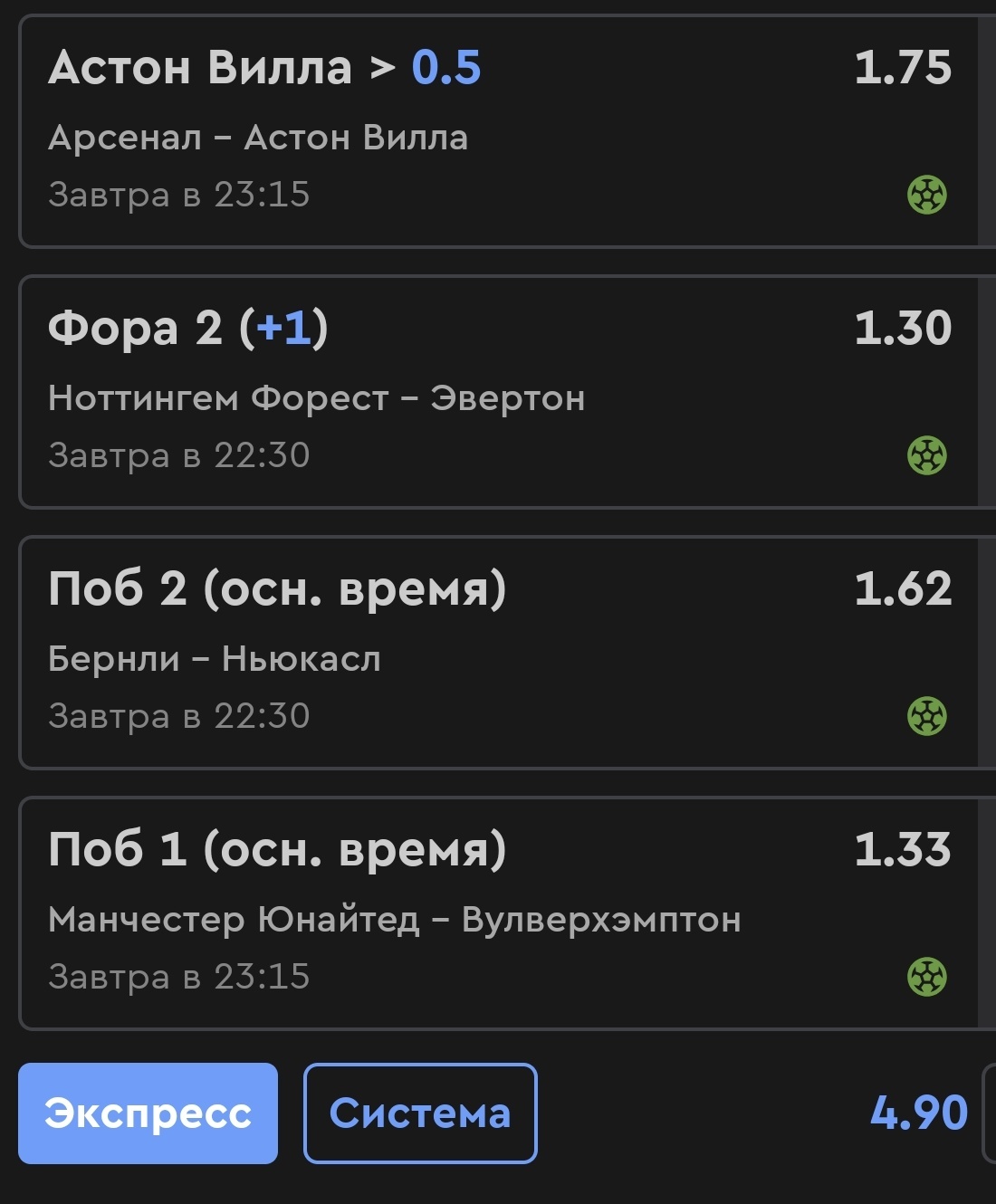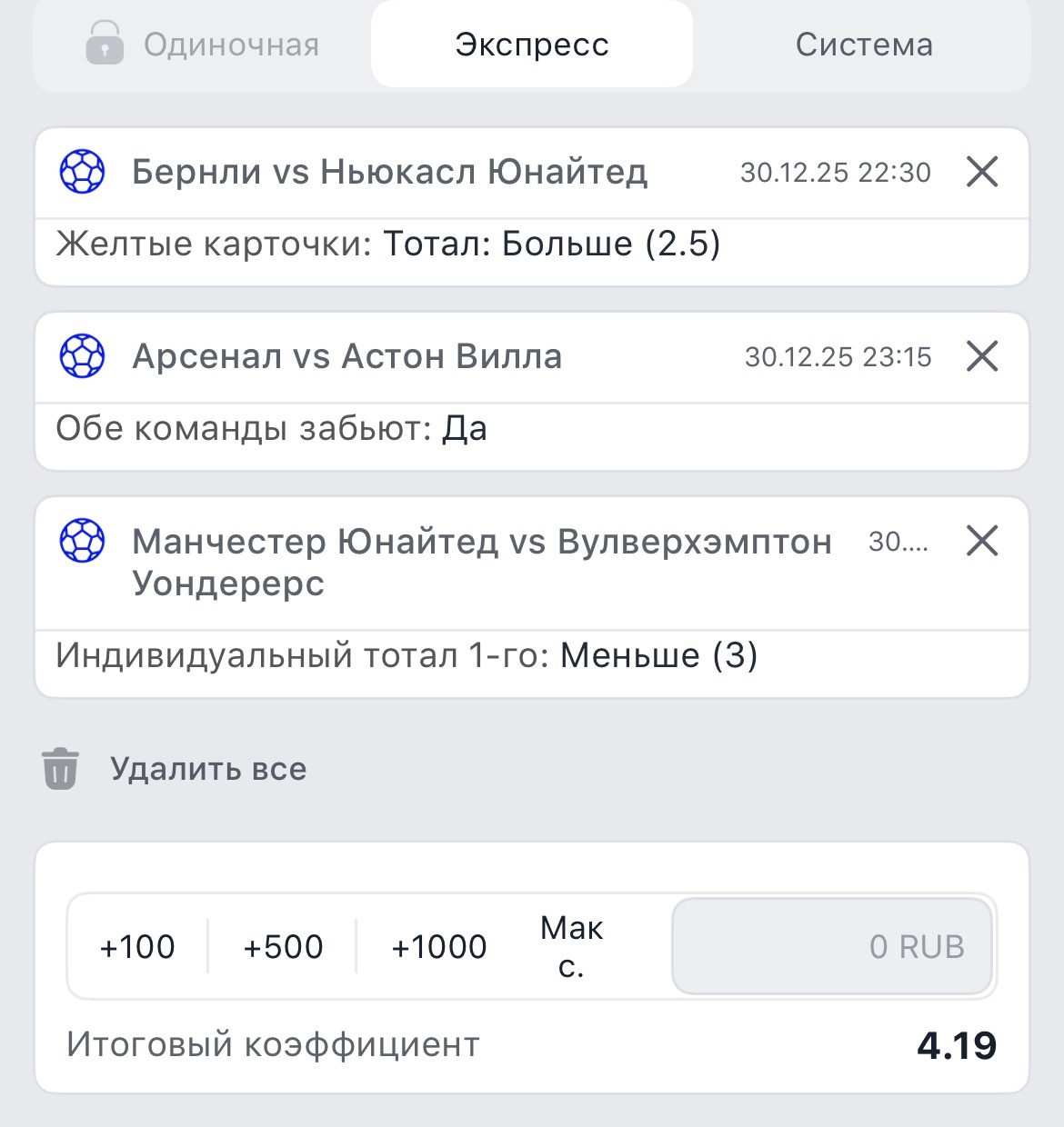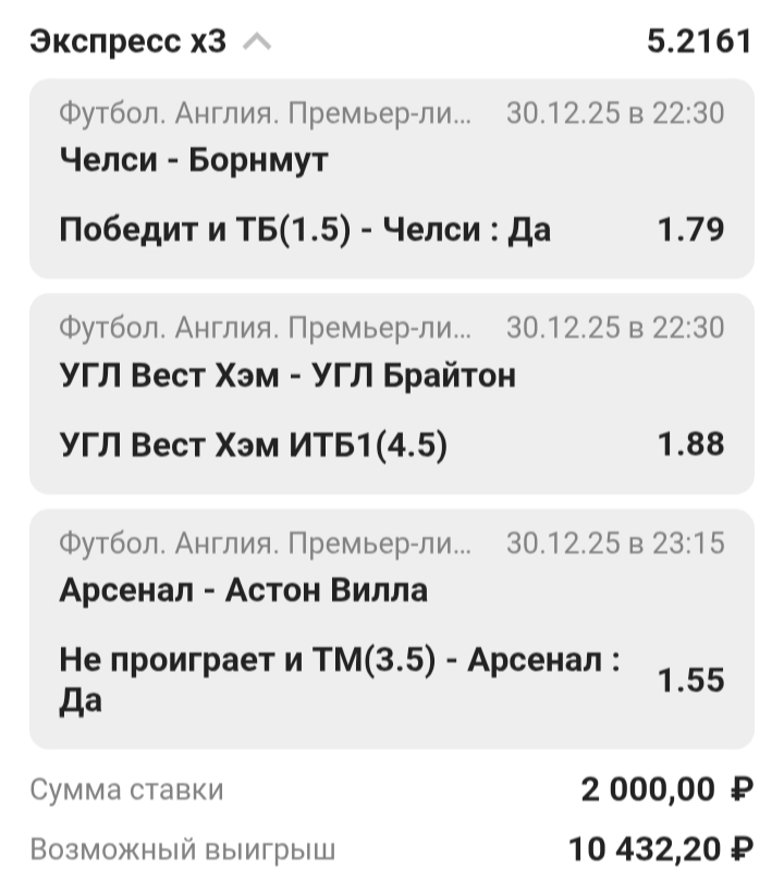 Приветствую команду ZiminBetting и участников группы! Всех с наступающими праздниками! Меня зовут Алексей, представляю вашему вниманию мой экспресс на матчи АПЛ 30 декабря: