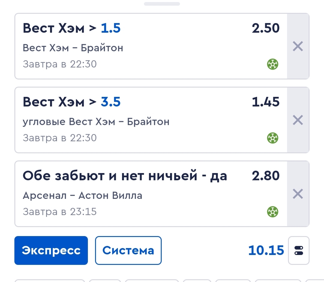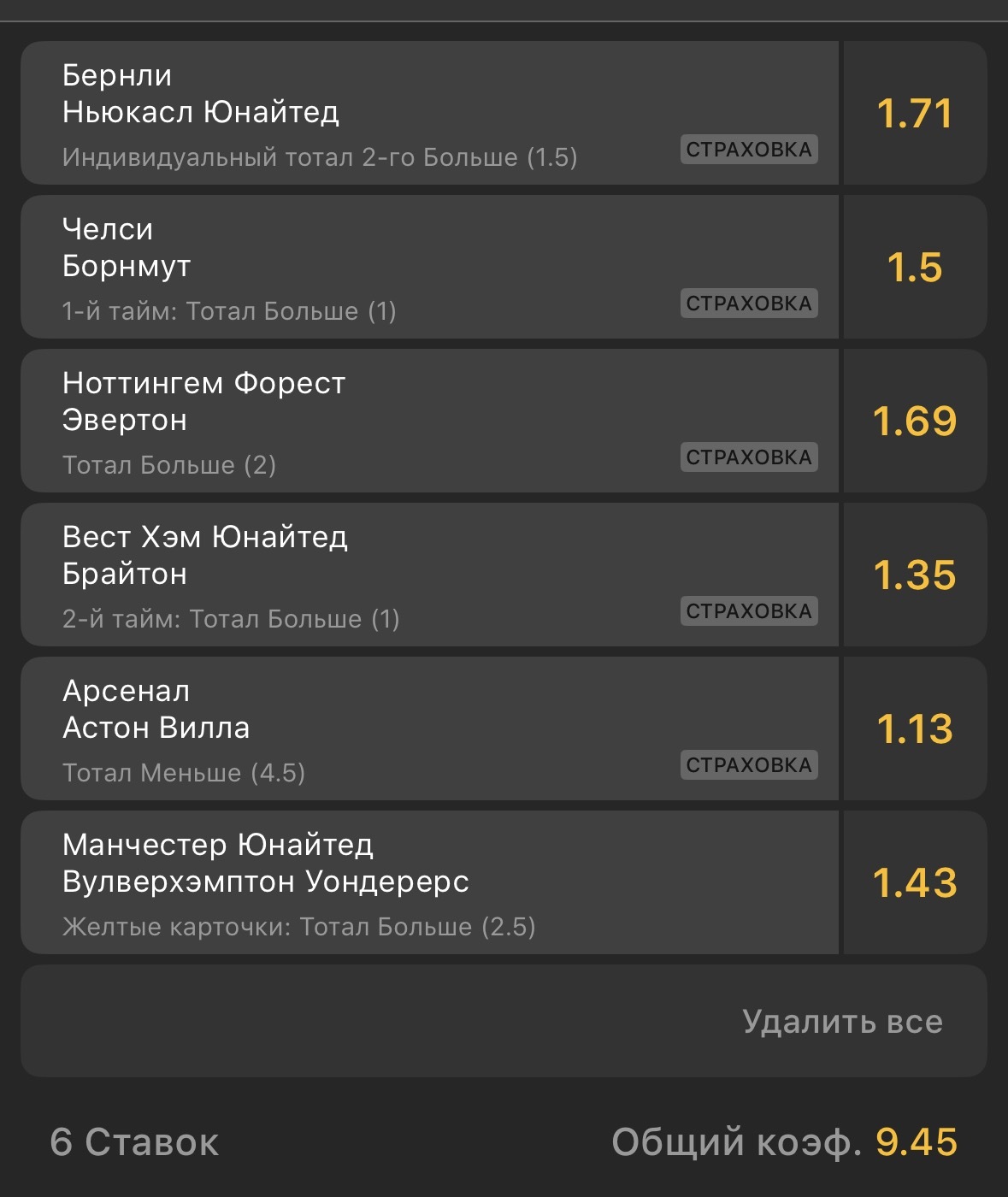 Ноттингем - Эвертон. Тут результат не очевиден, так как хозяева иногда выдают хороший матч и выносят сильных оппонентов а иногда наоборот. Поэтому просто взял тотал на двоих. Вест Хэм - Брайтон. В этой паре вижу голы во втором отрезке. Скорее игра раскачается не сразу.