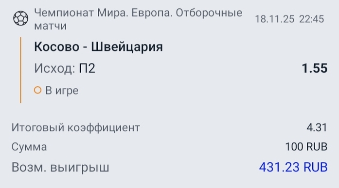 Матч 2: Косово - ШвейцарияПрогноз: Тотал: 1,5 БТоже особо ничего не решающий матч, разве что на кону прямая путевка на ЧМ. Косово пропустили за пять игр только в одном матче, четыре безответных от той же Швейцарии, а сама Швейцария пропустила всего один от шведов пару дней назад, поэтому предположу повторения голевого матча между этими сборными.